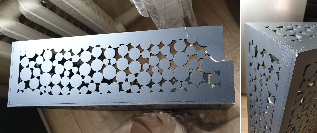 ВАЖНО! Настоятельно рекомендуем нашим клиентам внимательно принимать грузы. Обязательно проверяйте в присутствии водителя целостность упаковки и отсутствие видимых повреждений, после чего вскрывайте упаковку и проверяйте само изделие. Если груз доставлен вечером, внесите его в освещённое помещение и проверьте там. Мы с нашей стороны обеспечиваем качественную упаковку в плотный гофрокартон, бумагу и стрейч. Принимая от нас грузы, водители убеждаются в качестве упаковки. Однако нельзя исключить риск, что в дороге или при перегрузке на терминалах изделие окажется повреждено. Если вы вовремя заметите повреждение при вручении груза, не примете его и не распишетесь в документах транспортной компании, вам не придётся потом жалеть о напрасно потраченных деньгах, и огорчаться при виде испорченного изделия, как однажды случилось с нашим клиентом: