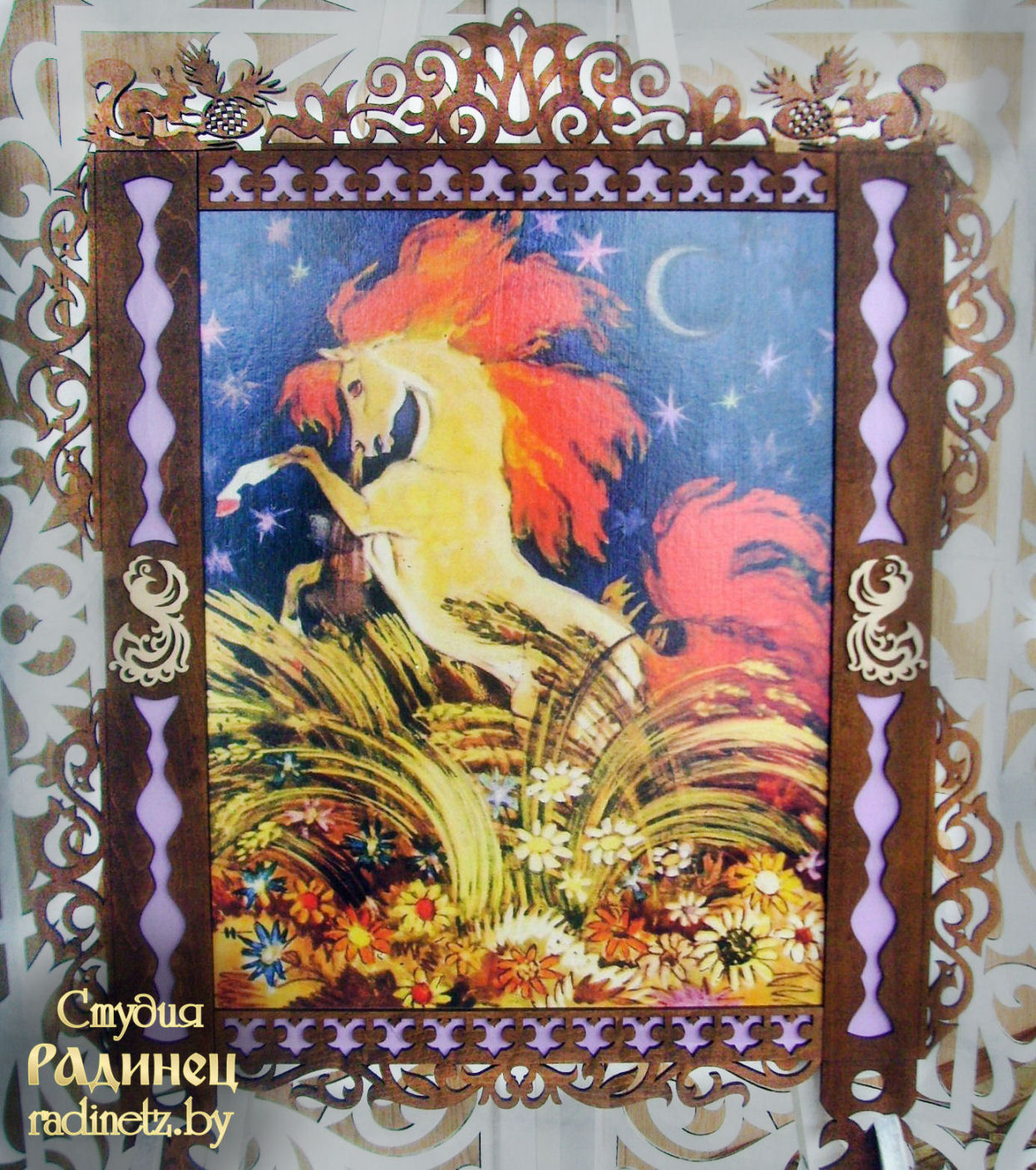 Отпечатанная в высоком качестве репродукция (на холсте или бумаге) наклеивается на твёрдое основание и покрывается во много слоёв лаком вручную, примерно как в технике декупаж. Рама в технике прорезной резьбы выбирается подходящая по сюжету картины и по вкусу заказчика. Мы отобрали самые изящные образцы декоративных рам для картин в рубрике Б1 (Рамы для картин и зеркал), можно заглянуть и в Б0 (Фоторамки и паспарту). Рама проектируется по размерам картины, затем вырезается лазером и обрабатывается лаком или краской. Твёрдое основание картины служит одновременно фоном для изготовленной резной рамы, причём резьба может частично выступать за пределы фона. Этому фону придаётся цвет, гармонично сочетающийся с цветовой гаммой художественного полотна. Таким образом, одухотворяющее воздействие на человека самой картины, которое для нас имеет самое главное значение, дополняется эстетикой резного обрамления, лакировки, цветного фона для рамы. Кроме того, покрытие лаком и твёрдое основание полотна делают его долговечным и нестареющим, поверхность картины можно протирать влажной салфеткой, можно не опасаться повреждения картины. Сзади изделие снабжается подвесами. Пример: